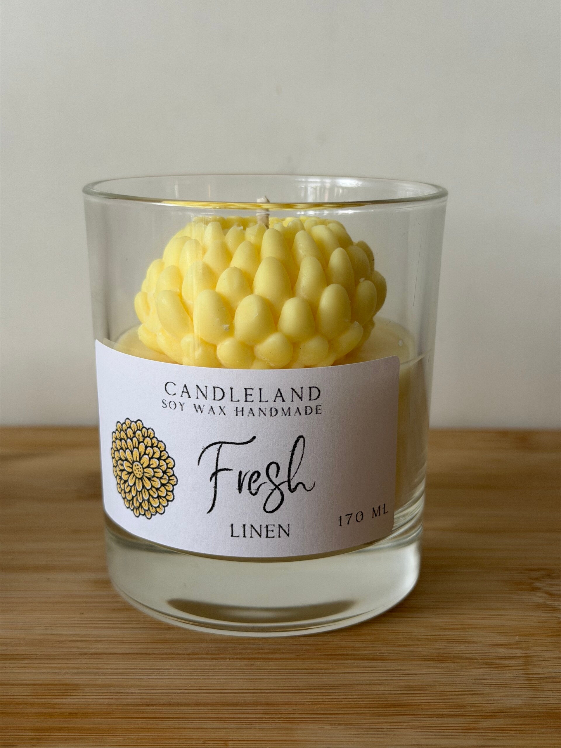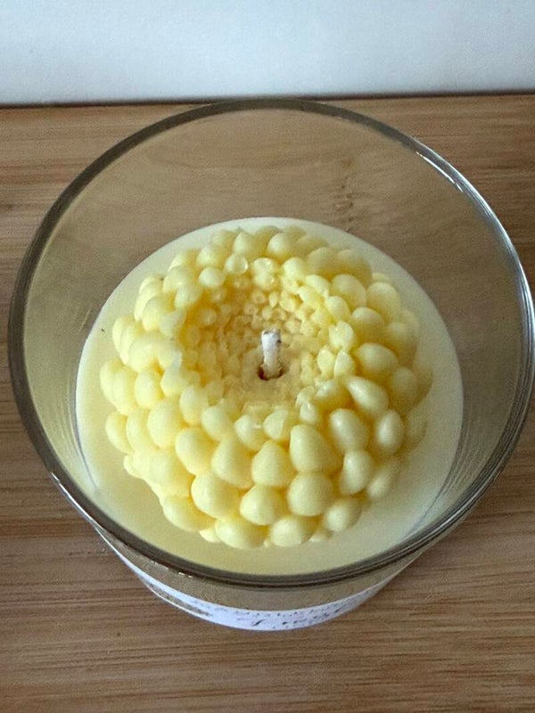 Breng een frisse en vrolijke sfeer in huis met deze handgemaakte geurkaars in de vorm van een prachtige gele Dahlia. Het gedetailleerde bloemdesign geeft de kaars een elegante en natuurlijke uitstraling, waardoor het een echte blikvanger is in elk interieur.